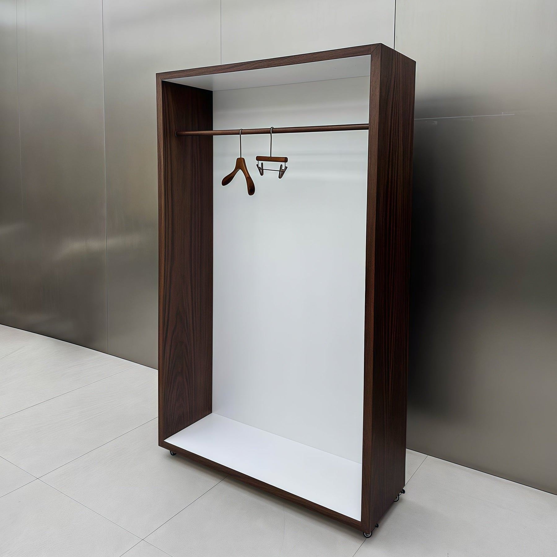 The walnut exterior paired with a light inner panel draws attention to the garments, improving overall display clarity.