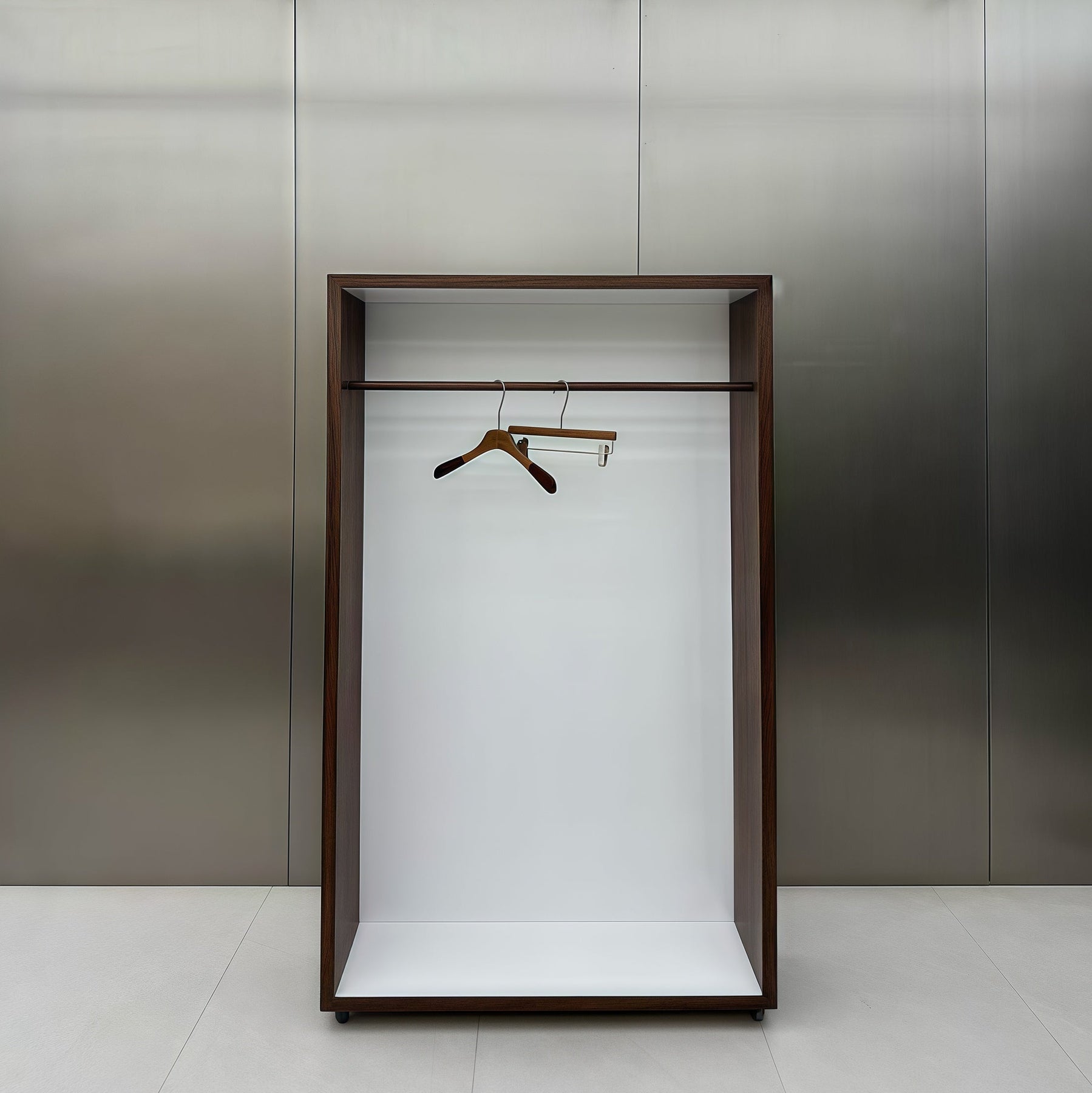 • Warm Walnut Finish for a Textured, Elevated Look                                                The rich walnut tone adds warmth and depth, creating an inviting and refined presentation for garments.