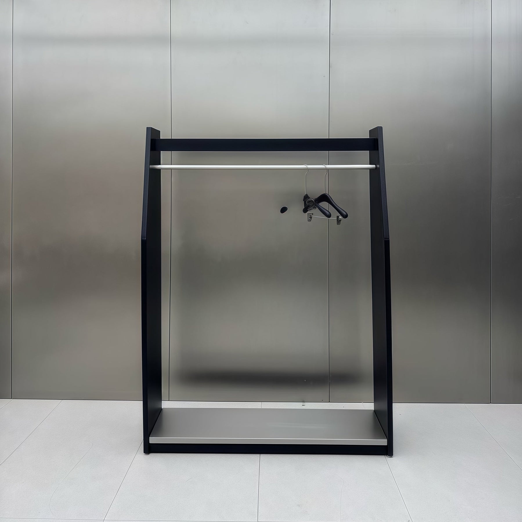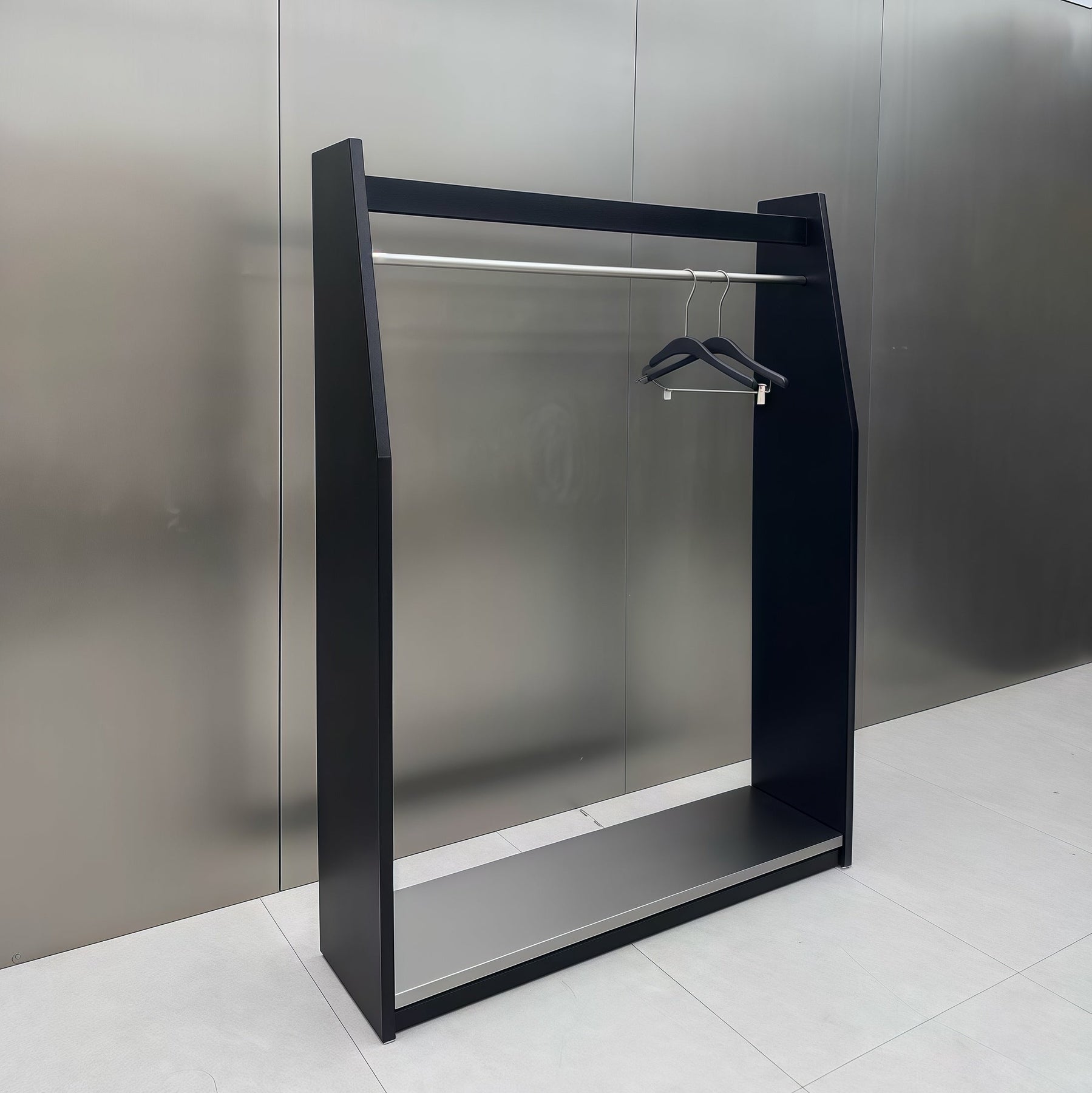 This black metal-tone display rack brings a cool, modern aesthetic with its clean lines and brushed metal accents. Designed for boutiques, designer stores, and contemporary retail spaces, it offers a refined way to elevate garment presentation and enhance overall visual merchandising.