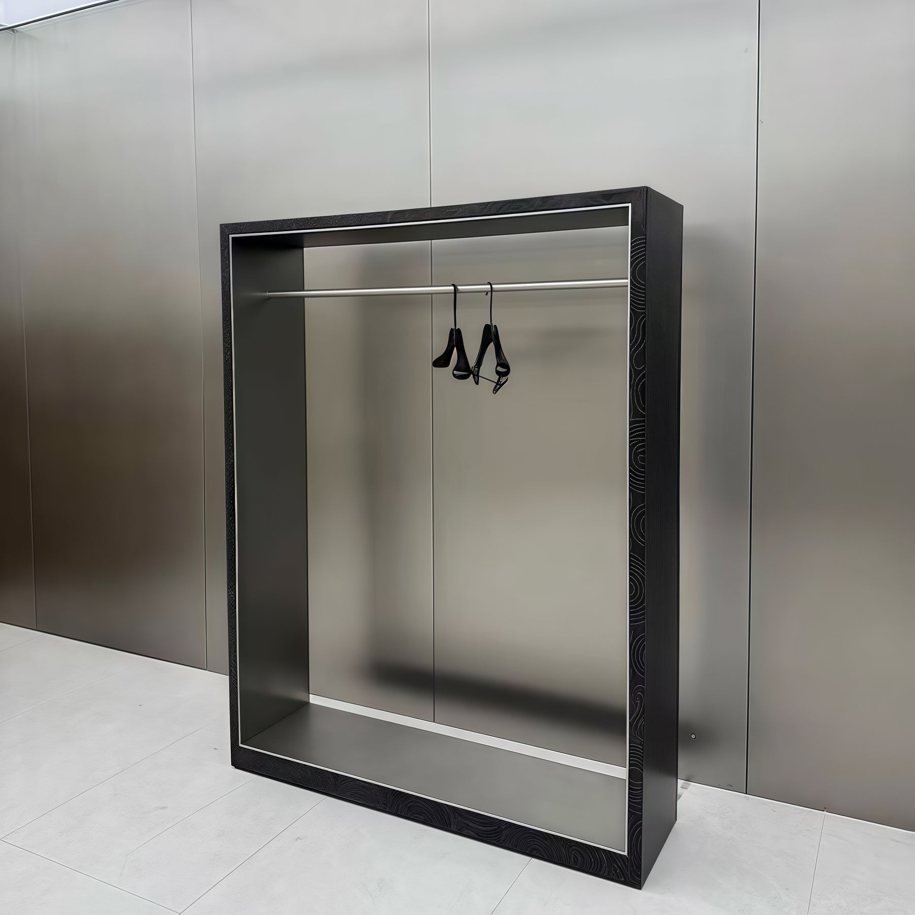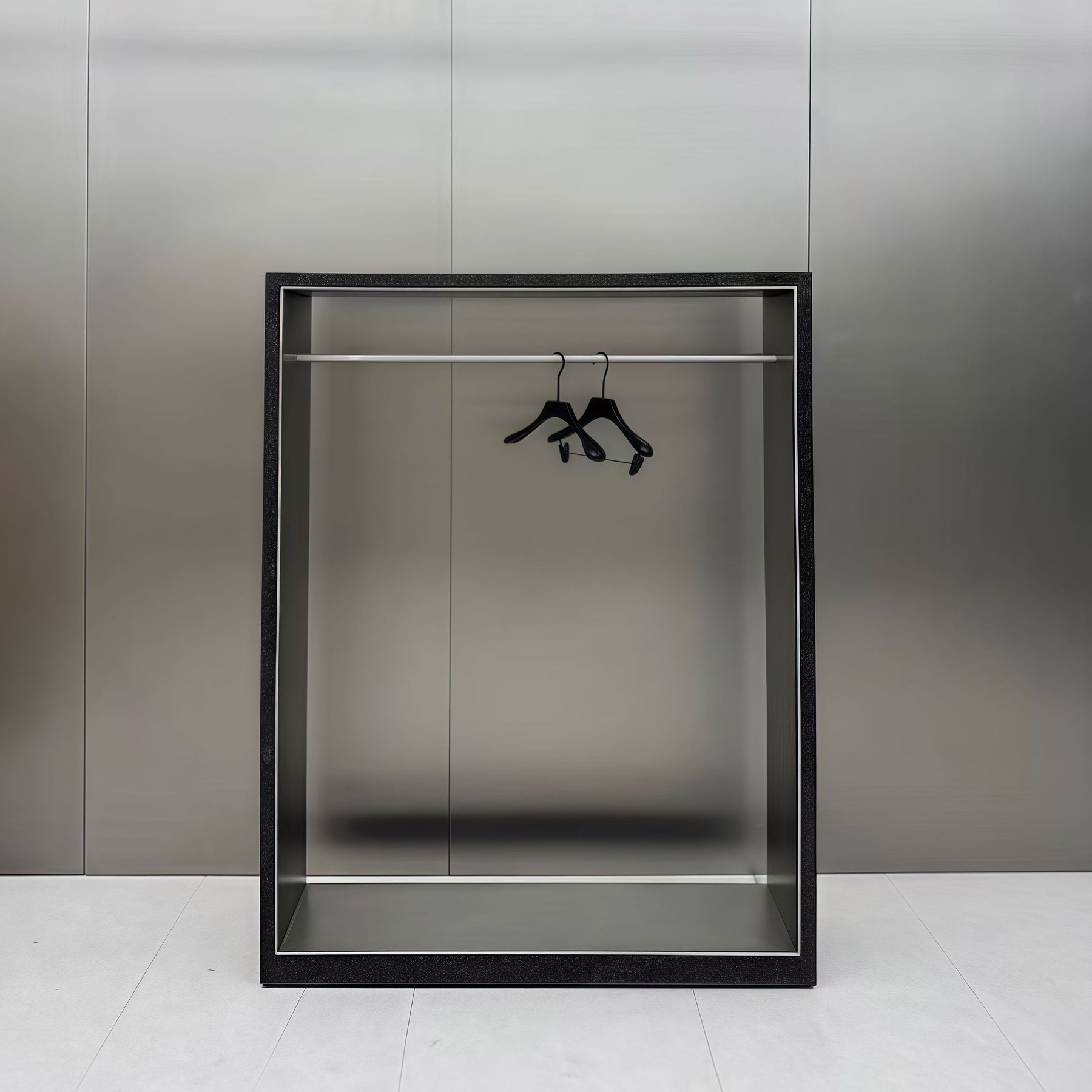 The rectangular form enhances visual clarity, allowing clothing pieces to stand out naturally.