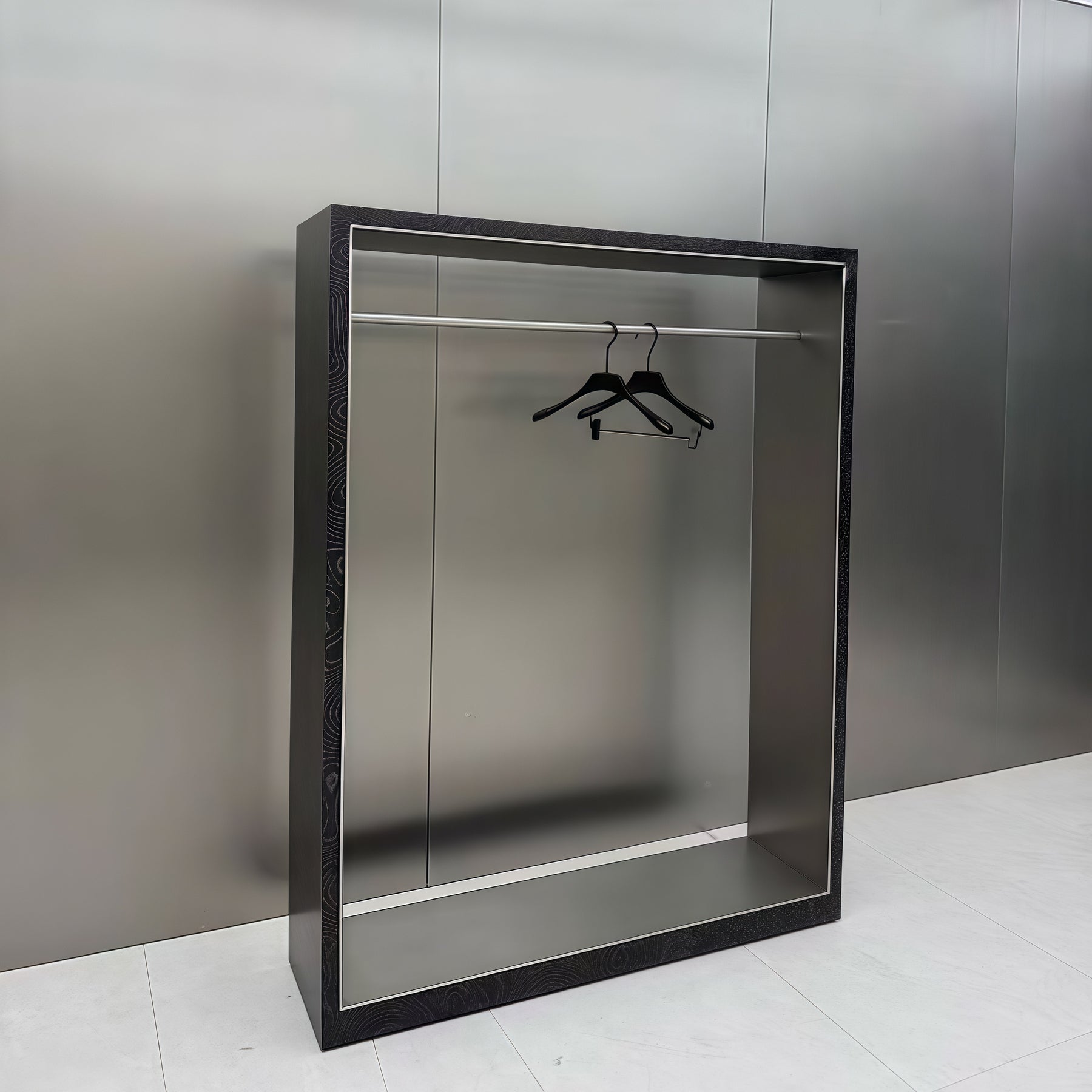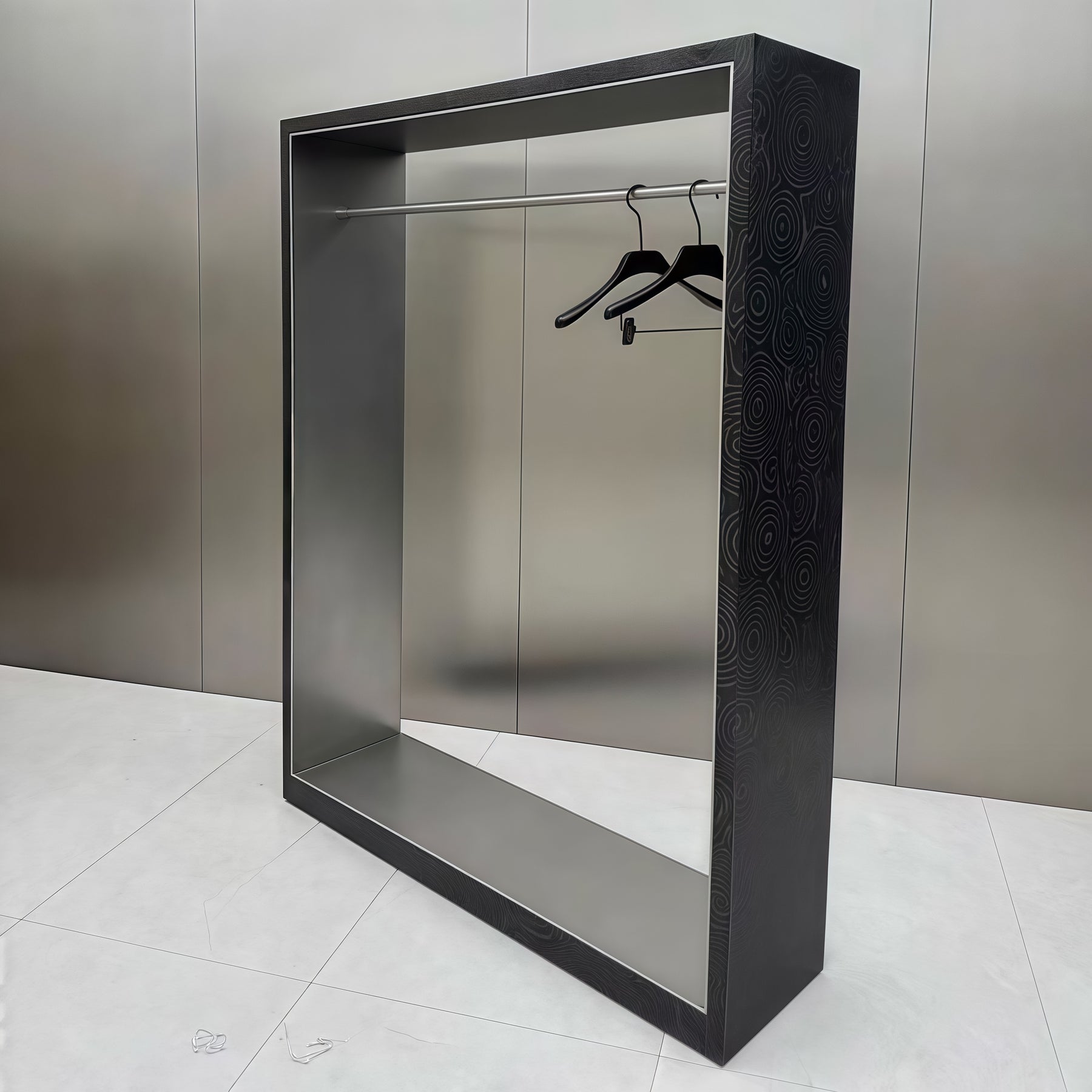 • Black Wood Grain Finish for a Refined, Design-Driven Look                                   The dark wood-grain texture adds depth and quiet sophistication, making it suitable for boutiques seeking a modern yet grounded aesthetic.