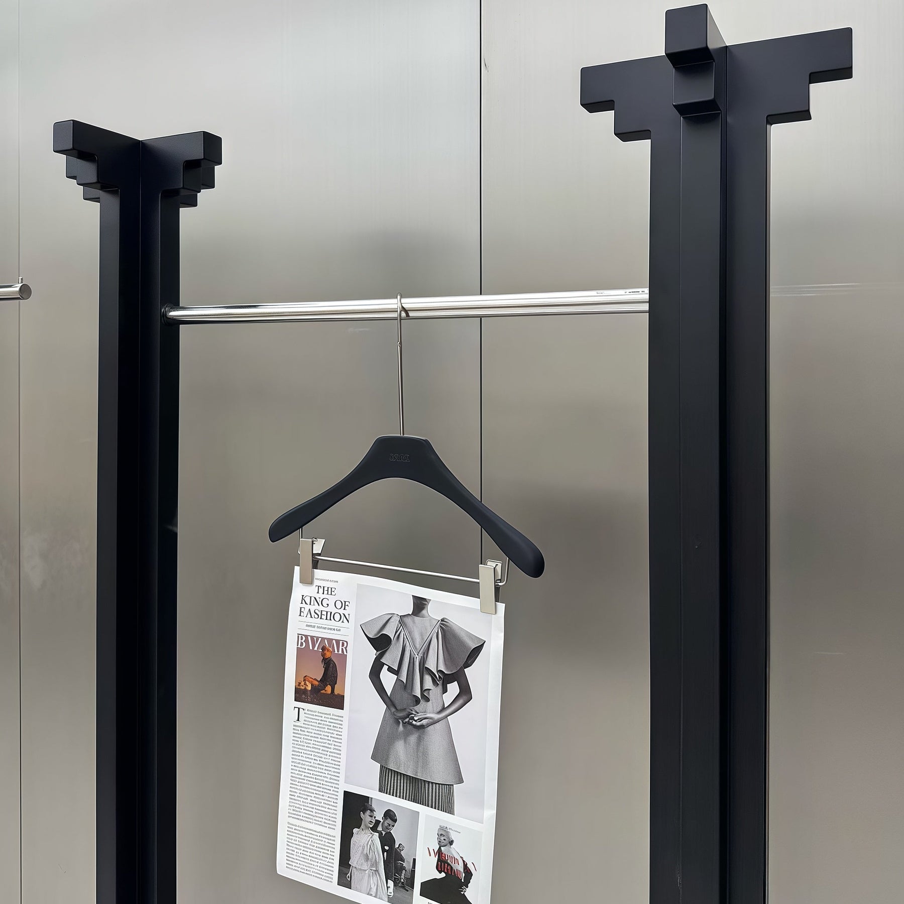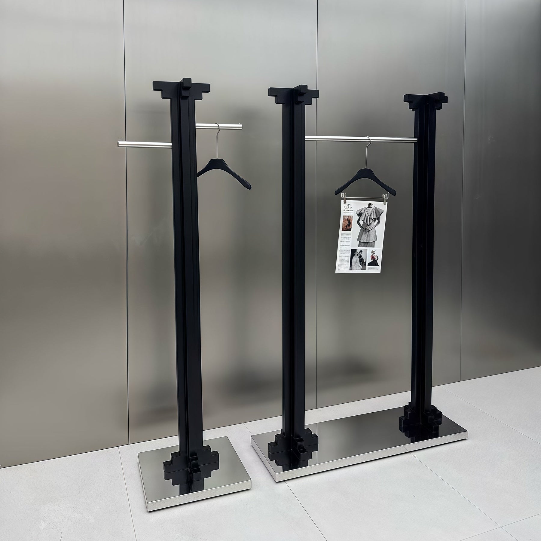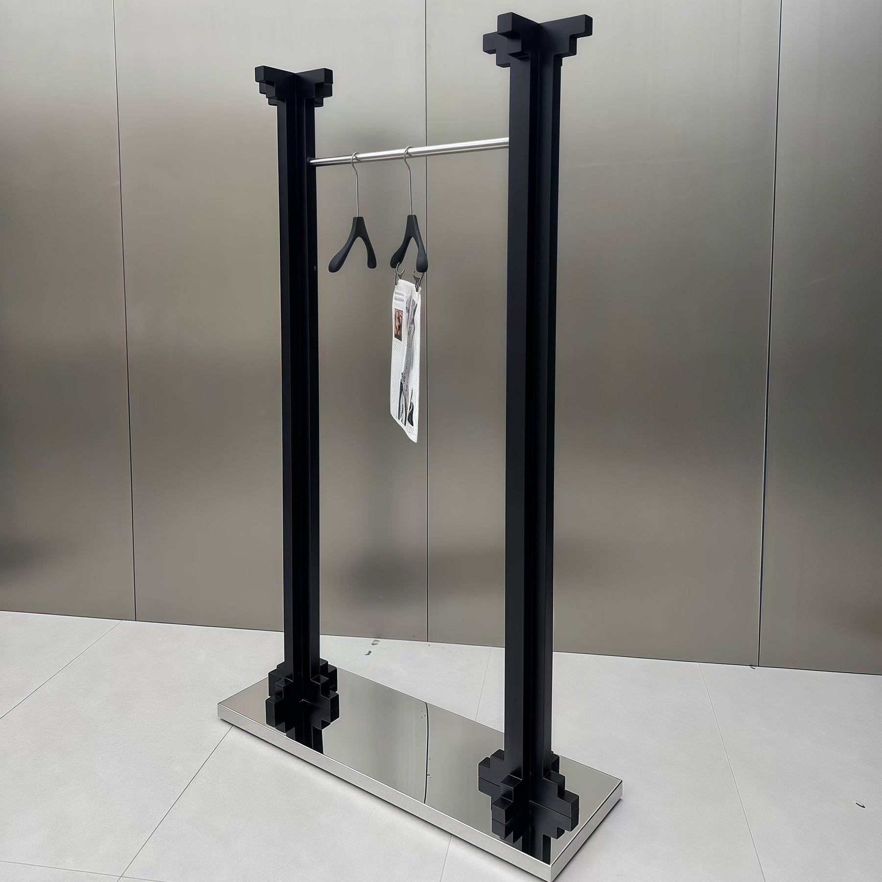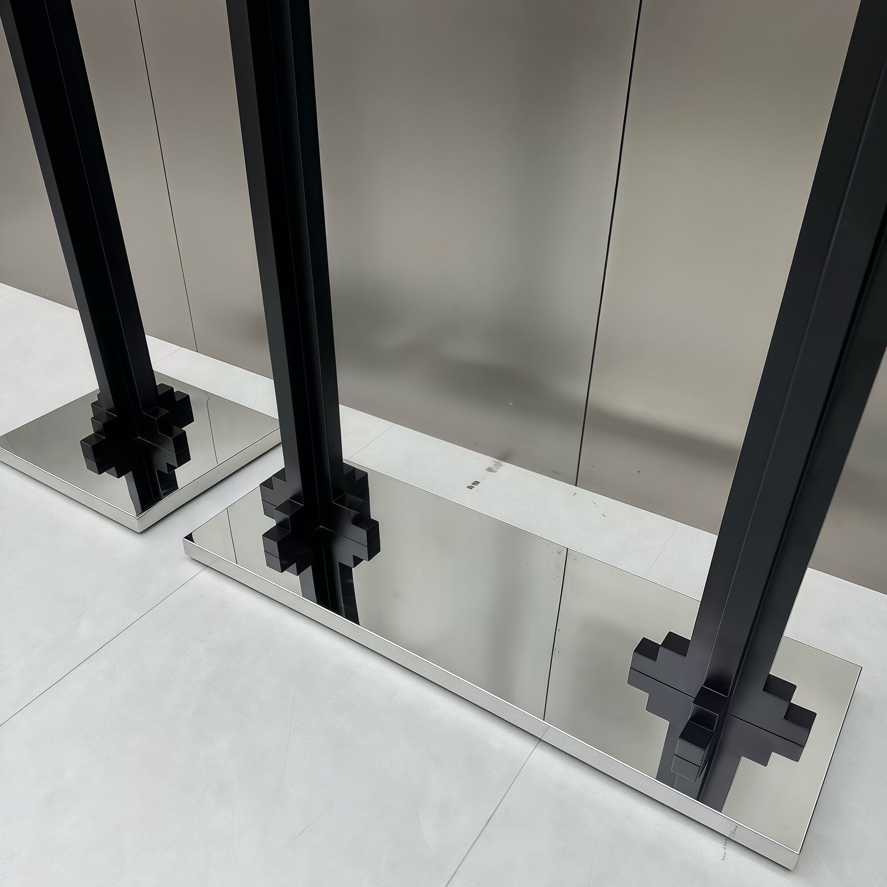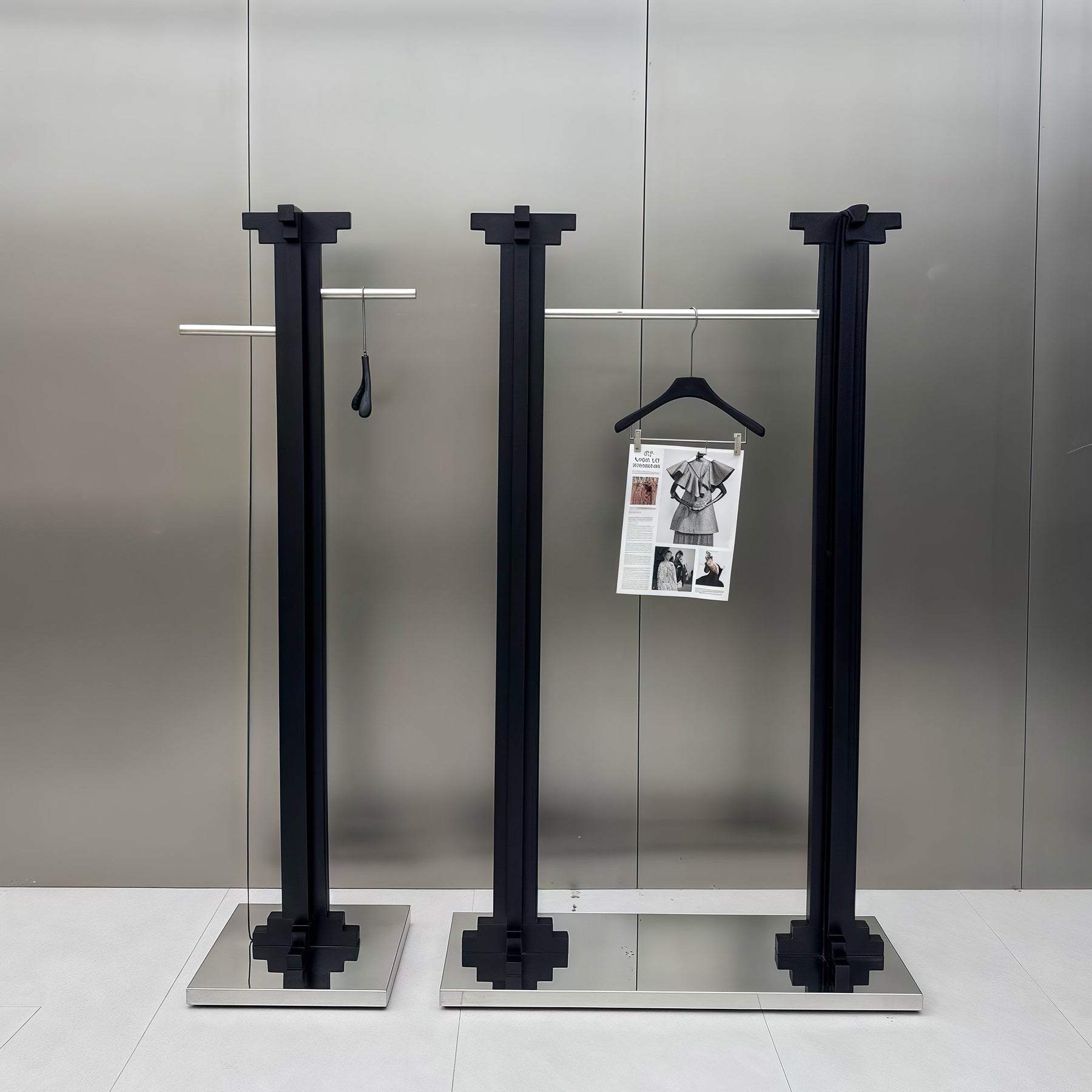 This minimalist black column display set pairs with a mirror-finish stainless steel base to create a contemporary, refined look. The large-and-small pairing offers versatile styling options, making it suitable for boutiques, showrooms, and creative display environments.