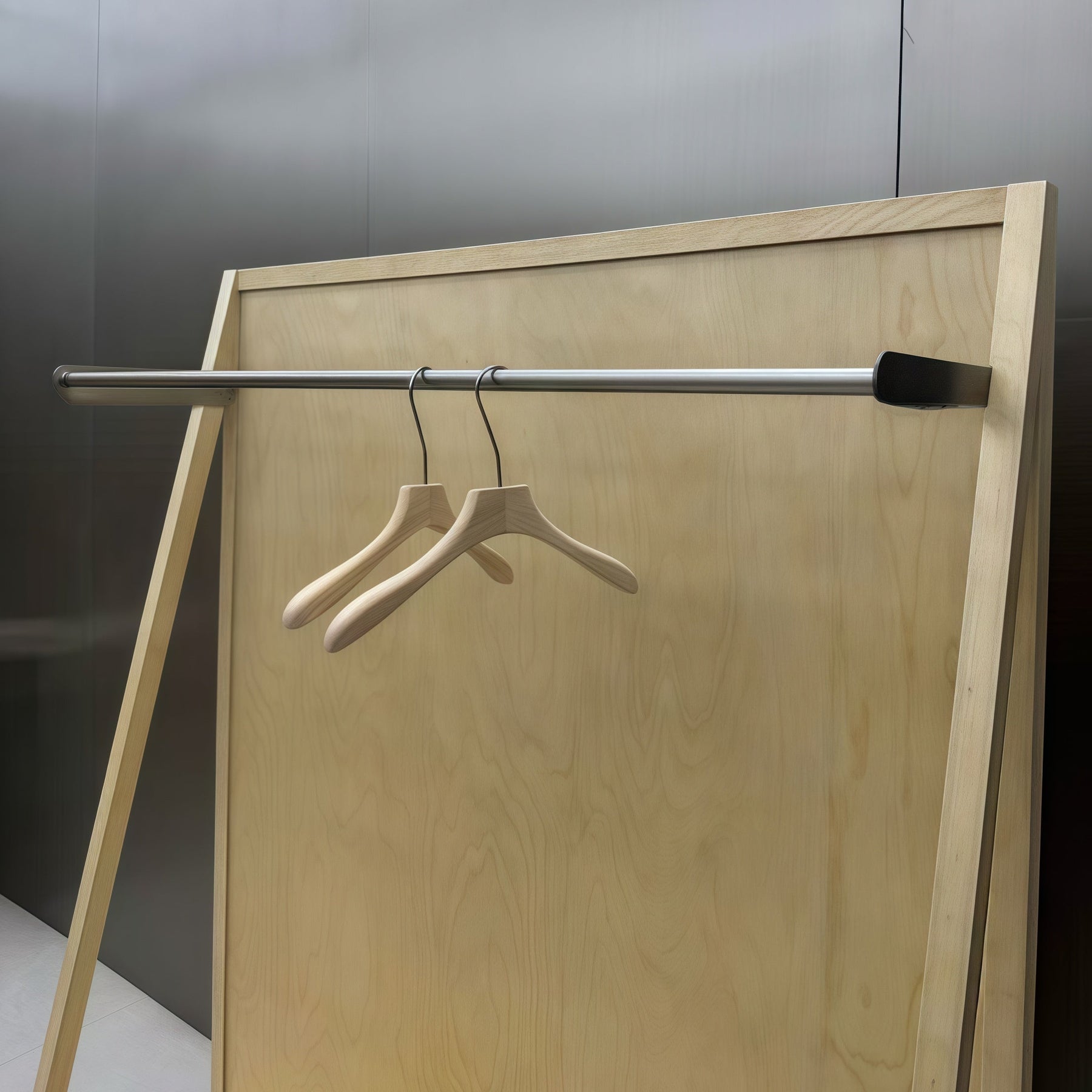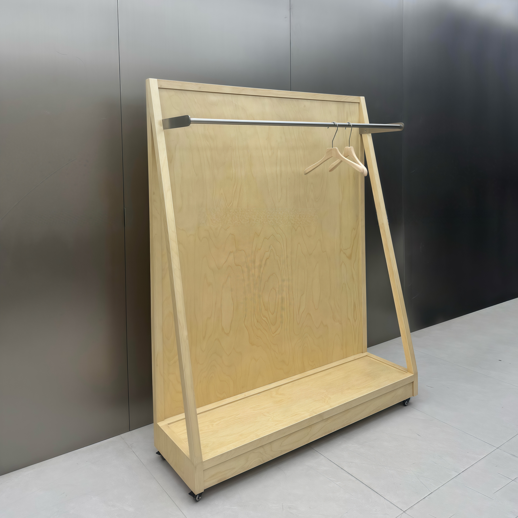 The Birch Wood Finish A-Frame Clothing Display Rack balances natural warmth with a clean modern outline. Its metal bar, functional lower platform, and softly textured wood surface make it a versatile option for boutiques and design-focused retail spaces. The overall look feels warm, minimal, and thoughtfully crafted.