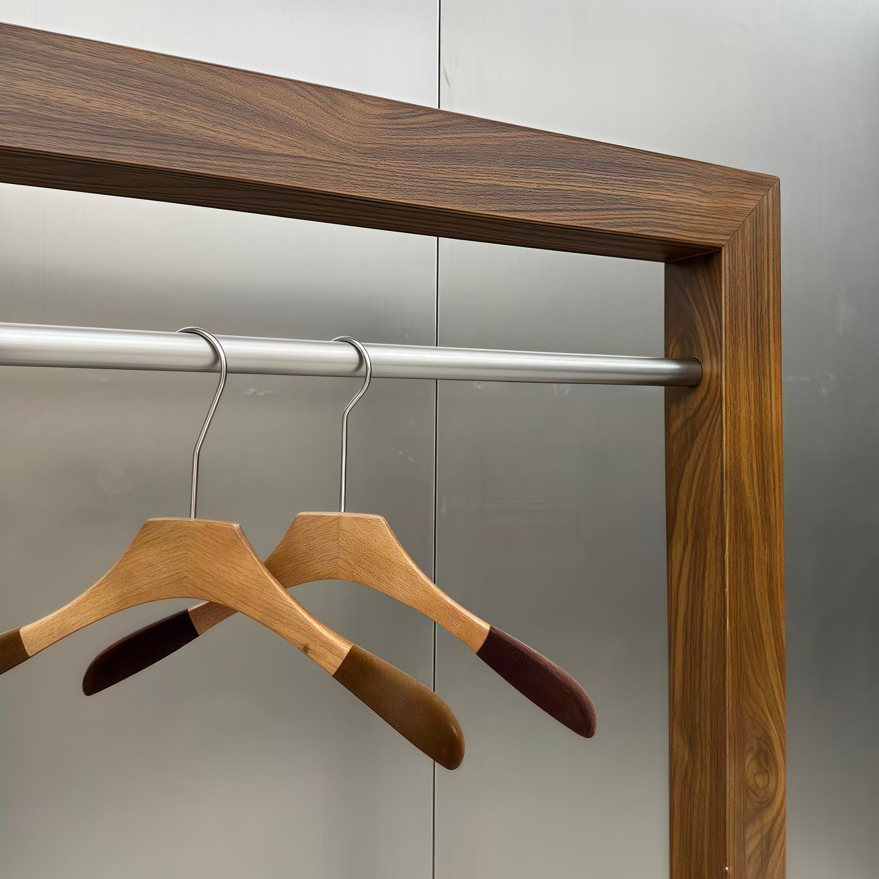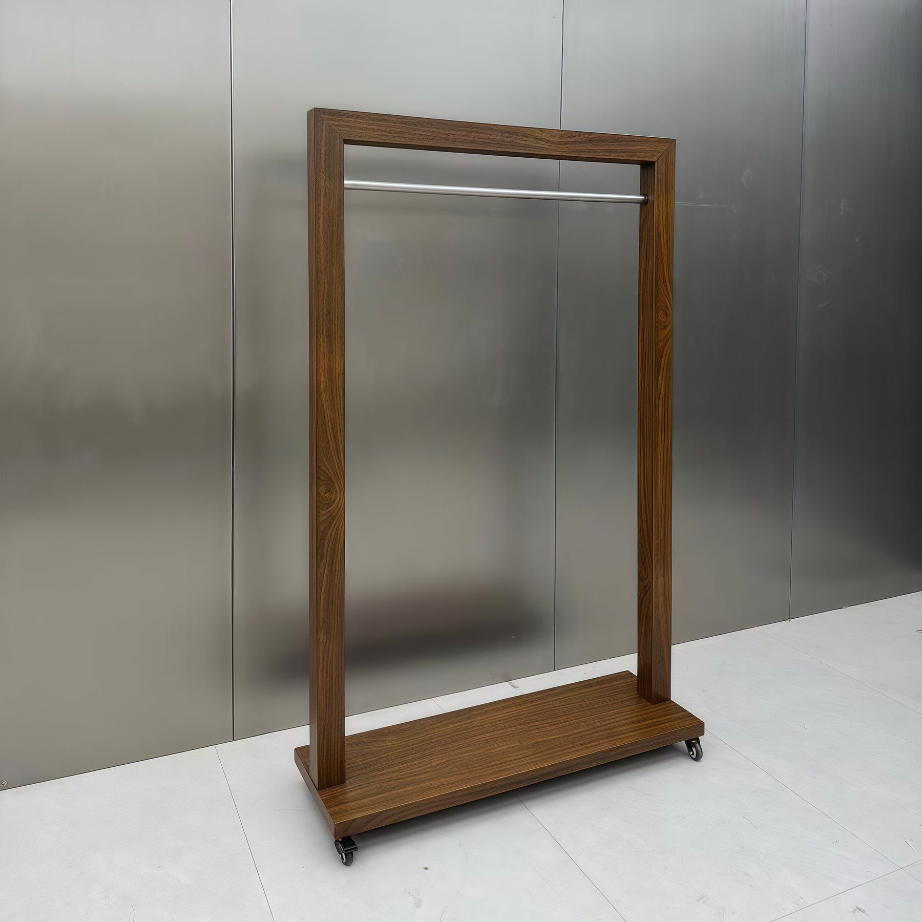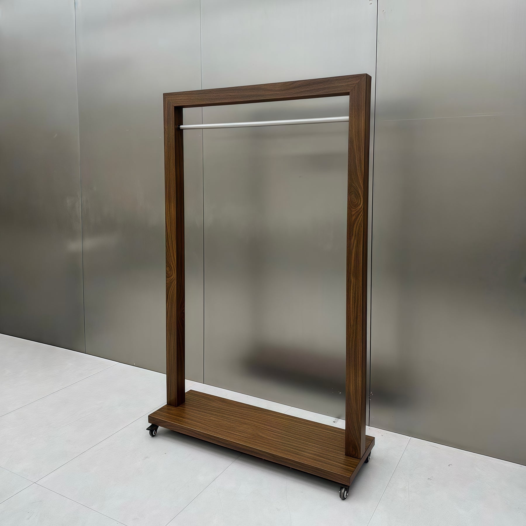 This wood-grain finish display rack offers a balance of stability and visual appeal, featuring natural textures and a clean structural design. Its mobile base adds versatility, making it a practical and stylish choice for retailers seeking a refined merchandising solution.