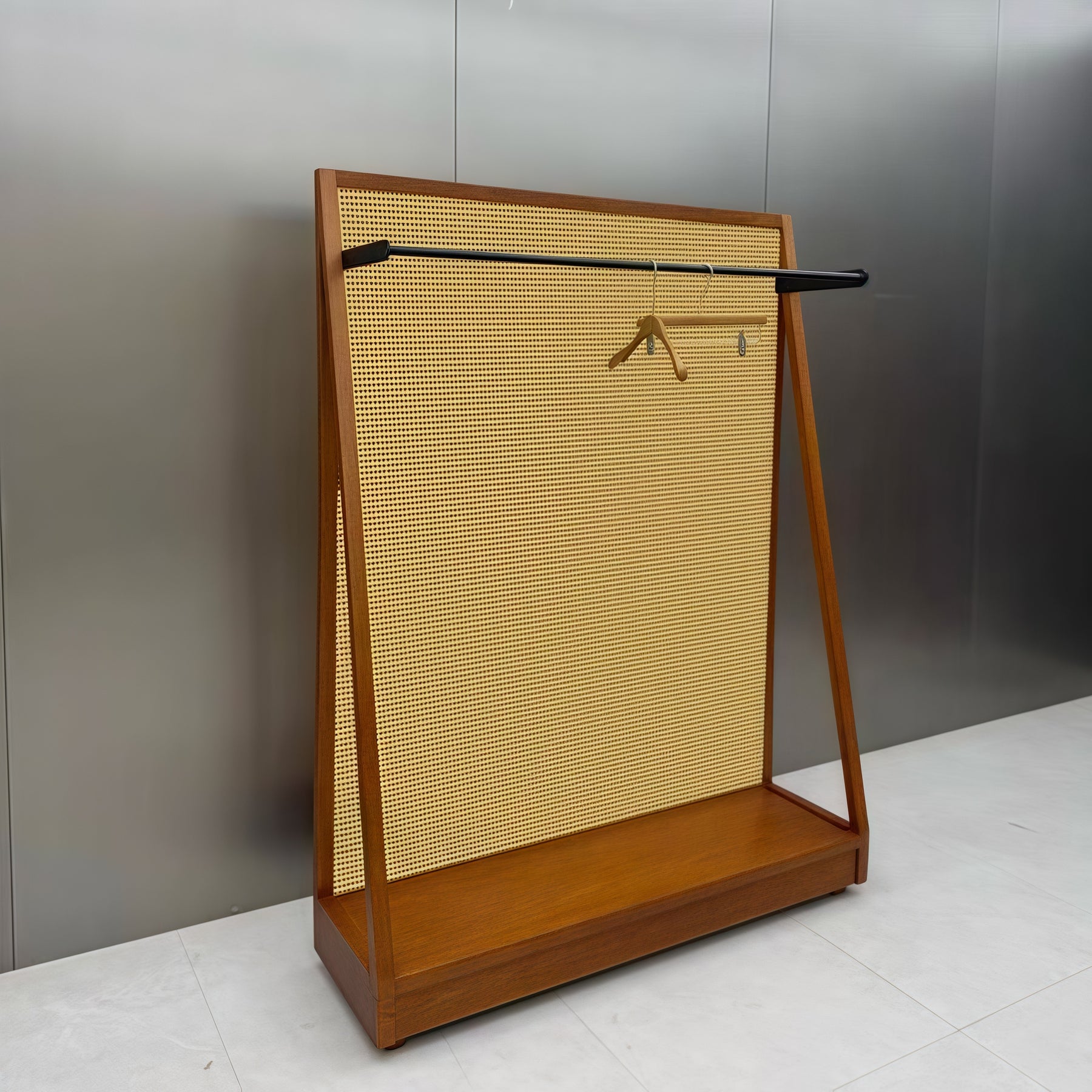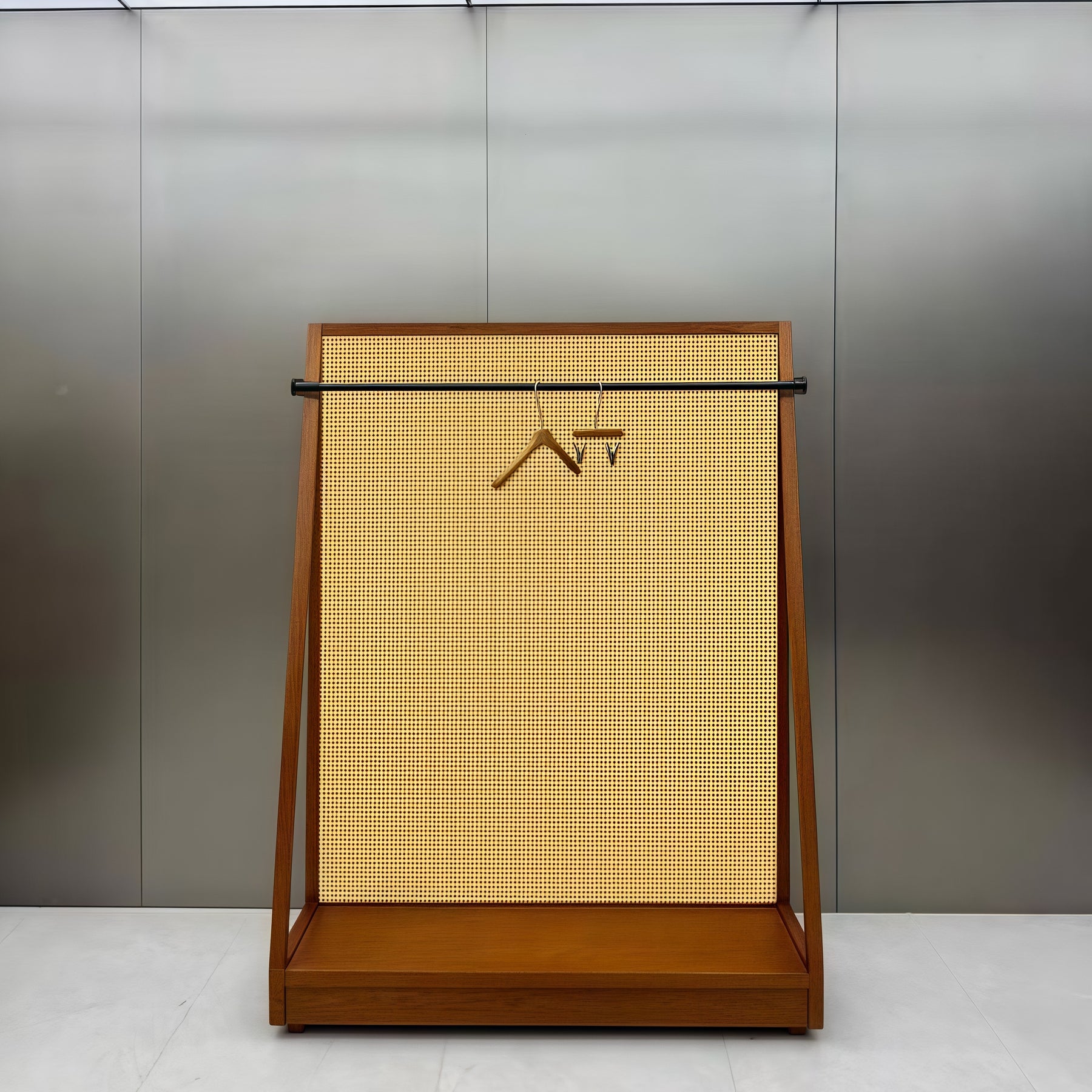 This display rack combines a walnut wood-grain frame, woven cane panel, and metal rail to create a restrained yet expressive structure. The design focuses on material contrast and balance, making it well-suited for retail spaces that value texture, order, and refined presentation.