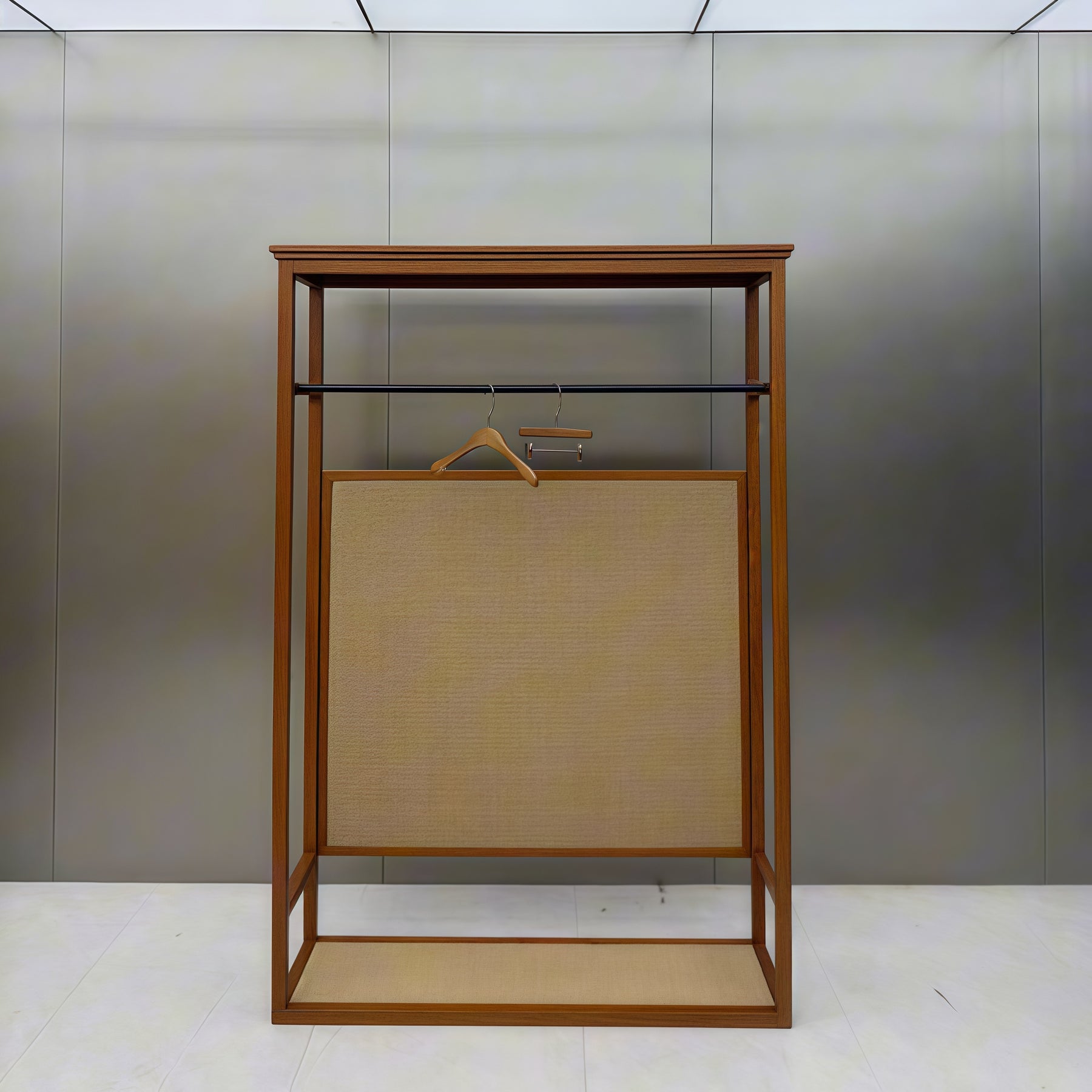 This display rack combines walnut woodgrain, woven fabric backing, and metal detailing to express a restrained yet layered vintage aesthetic suited to refined retail environments.