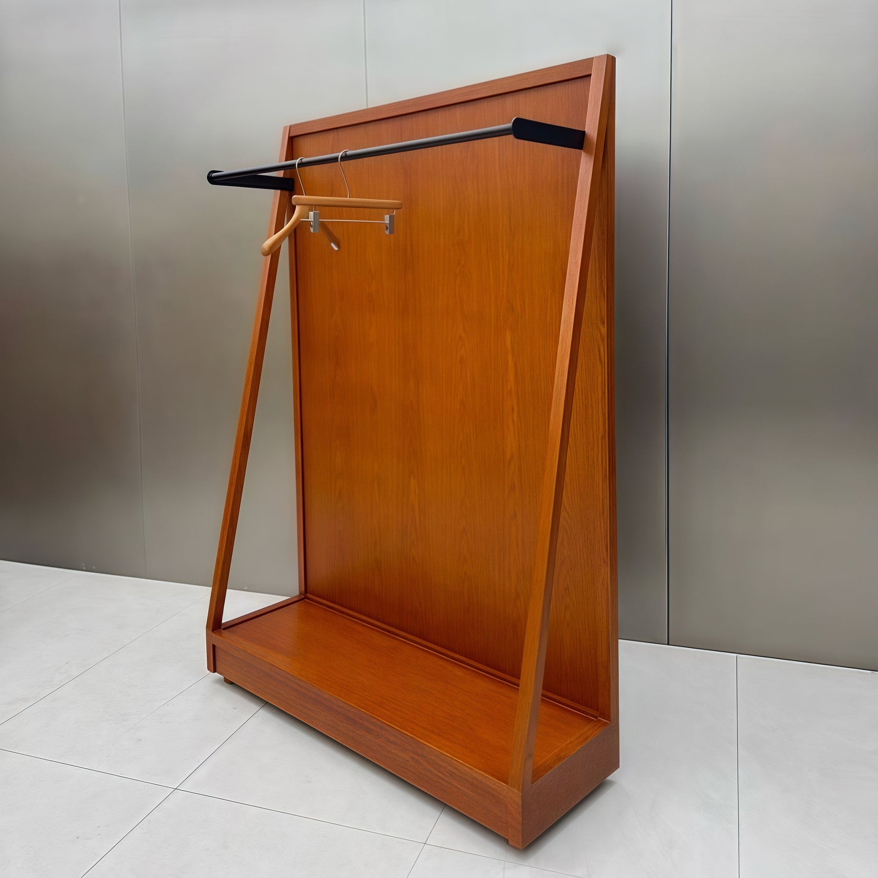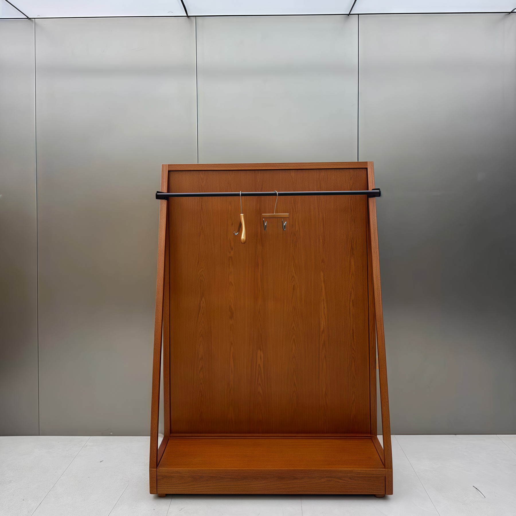 The metal hanging bar acts as a deliberate contrast to the wood, making the piece especially suitable for premium vintage stores, curated retail spaces, or environments that value display order.